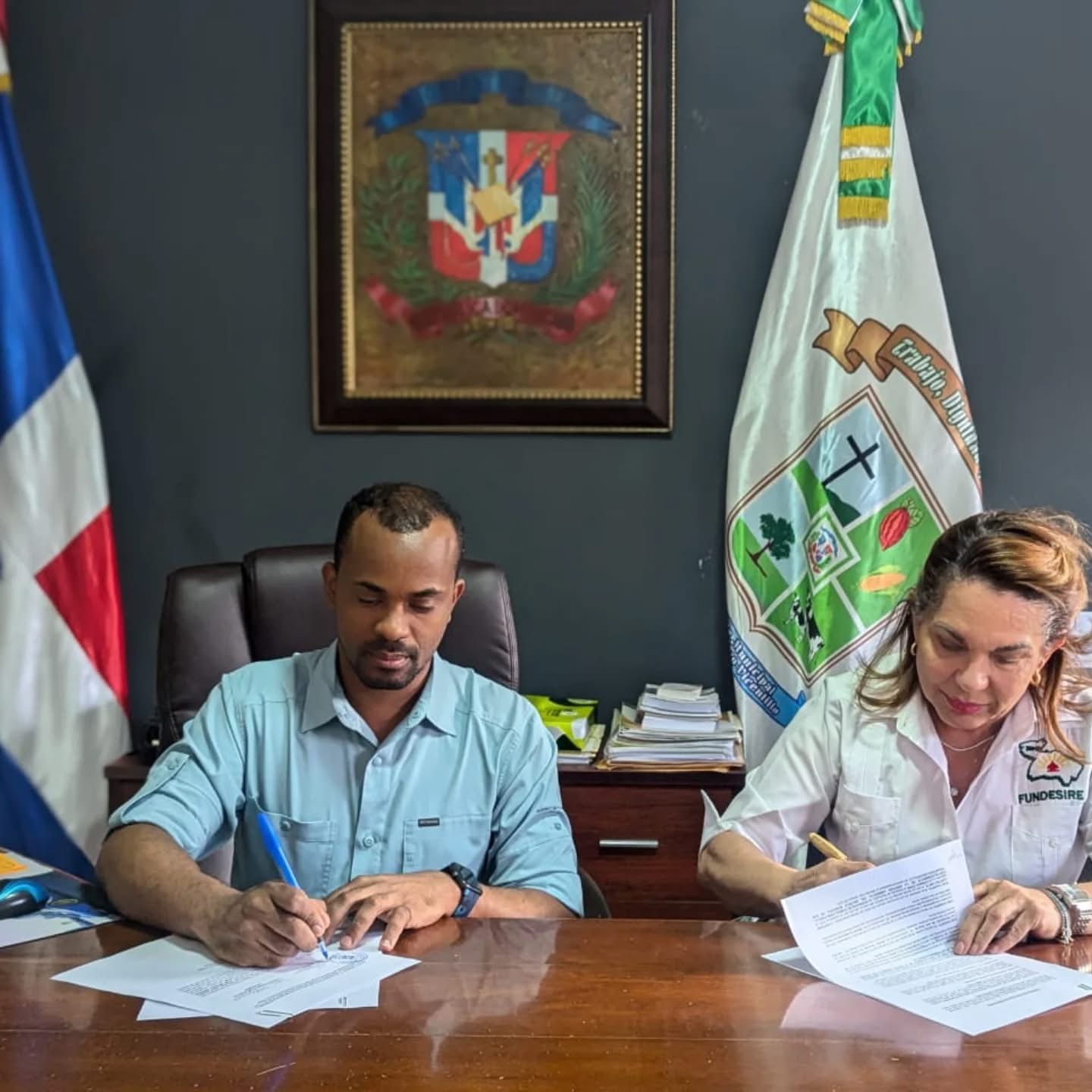 Rubricaron sus firmas en dicho contrato ascendente a 556,016.00 pesos, en representación de la Junta de Distrito, su Alcalde José Ortega y por FUNDESIRE la presidente Sra. Vilma Mercedes Torres Puesan de Hazim, quienes luego de la firma establecieron la línea de acción para iniciar los trabajos.
