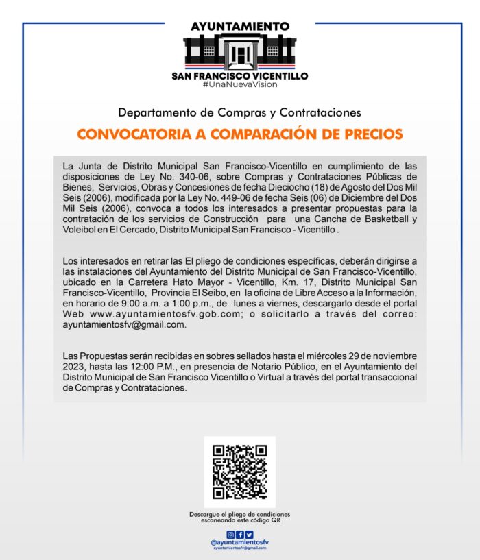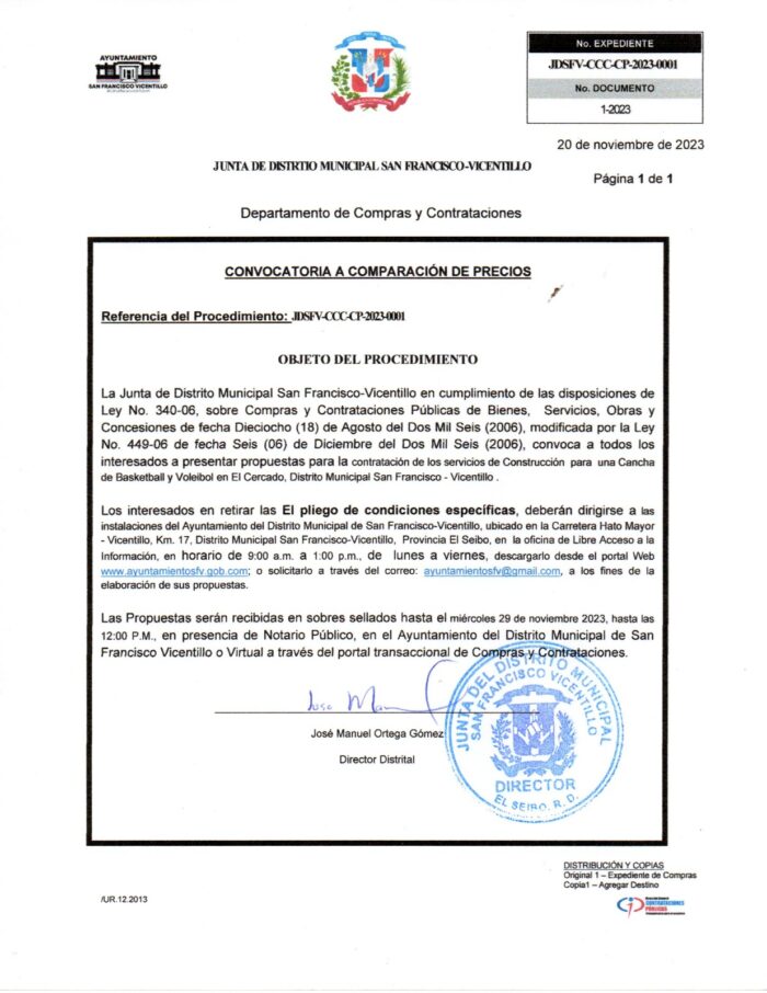 La convocatoria quedó abierta a todos los interesados en presentar propuestas, este lunes 20 de noviembre del presente año, mediante el proceso de Comparación de Precios Ref. No. JDSFV-CCC-CP-2023-0001, en cumplimiento de las disposiciones que establece la Ley No. 340-06, sobre Compras y Contrataciones Públicas de Bienes, Servicios, Obras y Concesiones de fecha Dieciocho (18) de Agosto del Dos Mil Seis (2006).