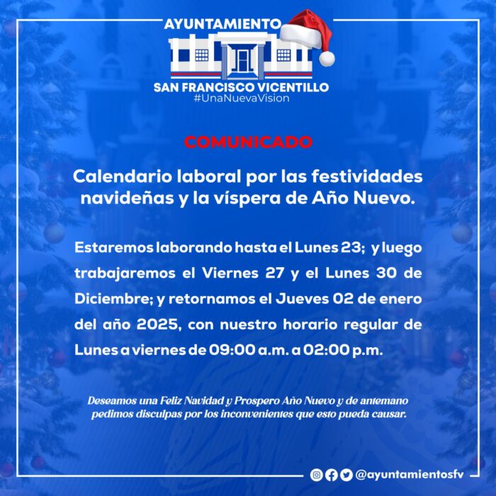 Calendario laboral por las festividades navideñas y la víspera del Año Nuevo.