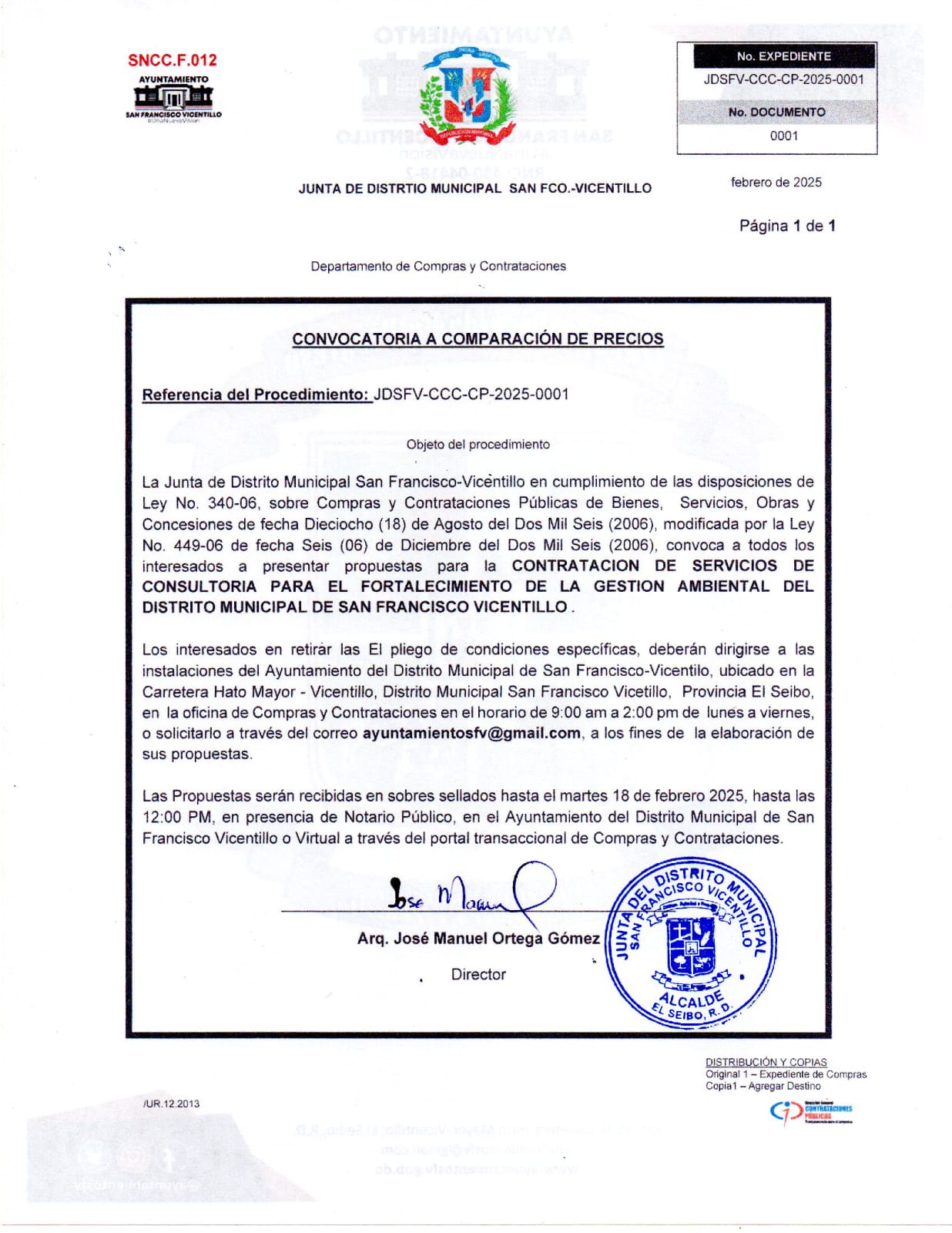 San Francisco-Vicentillo, El Seibo.- la Junta Distrital de San Francisco-Vicentillo invita a todos los interesados a presentar propuesta para la contratación de los servicios de Consultoría para el Fortalecimiento de la Gestión Ambiental en San Francisco-Vicentillo, por un monto de hasta 9,000 Euros.
